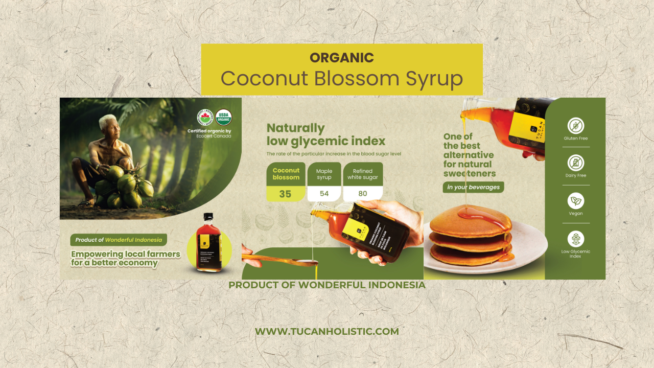 - Hand-picked coconut flower sap | to prevent harming the tree and to preserve the quality