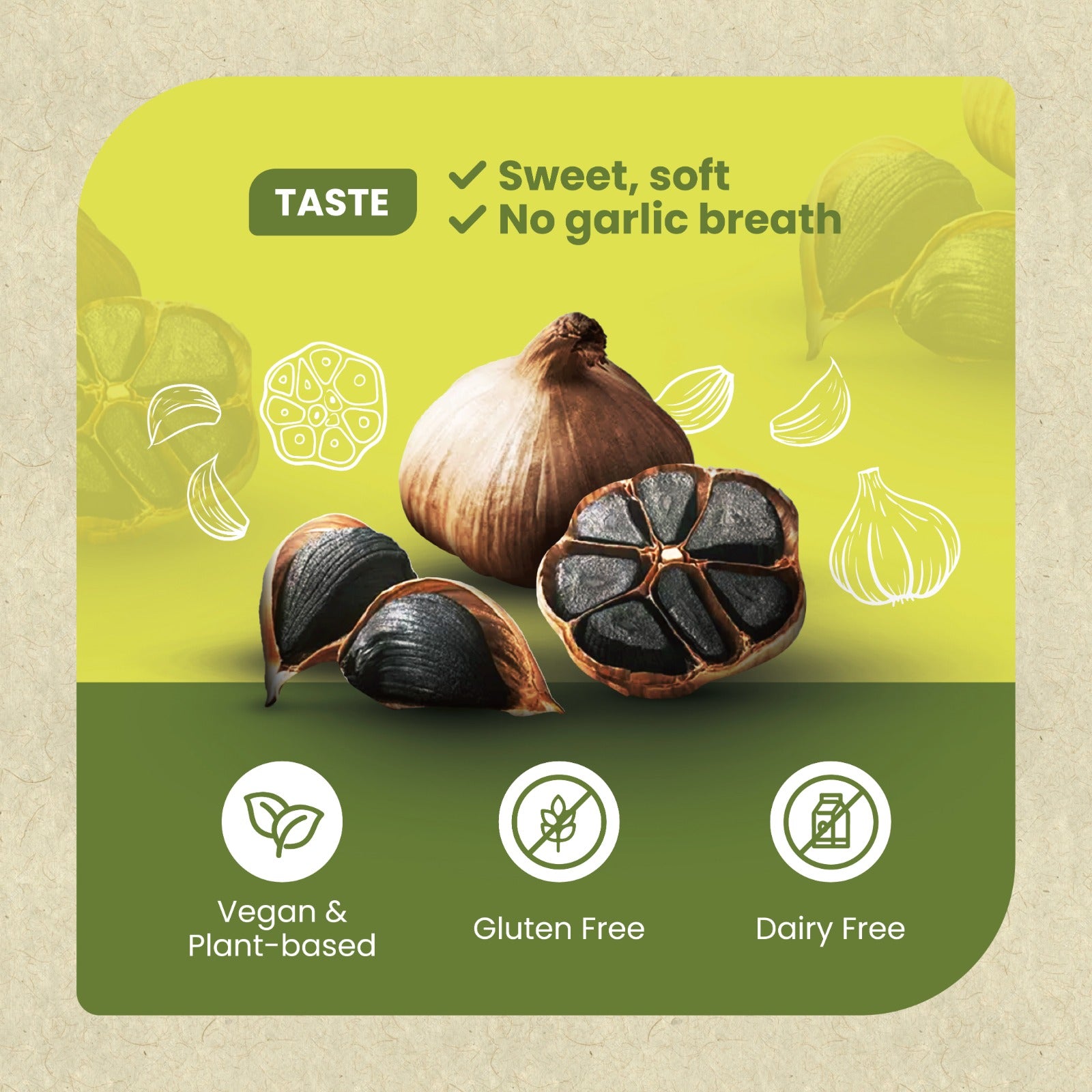 Not all black garlic is created the same. Ours are carefully aged over 30 to 40 days, to deliver a blend of umami-richness and complex sweetness, offering all the health benefits of garlic without the traditional garlicky taste, garlic breath, or sharp bite.
